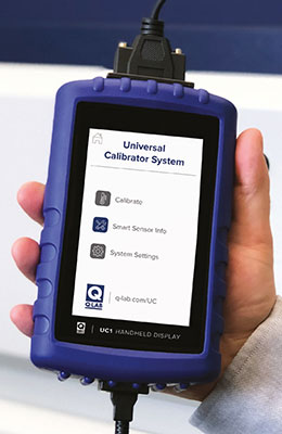 The universal calibrator system (UC) is a revolutionary, handheld device for calibrating temperature and irradiance across all Q-Lab weathering chambers. It utilizes inexpensive, modular, and disposable “smart sensors” to simplify calibrations and dramatically lower operating costs over competing approaches.
